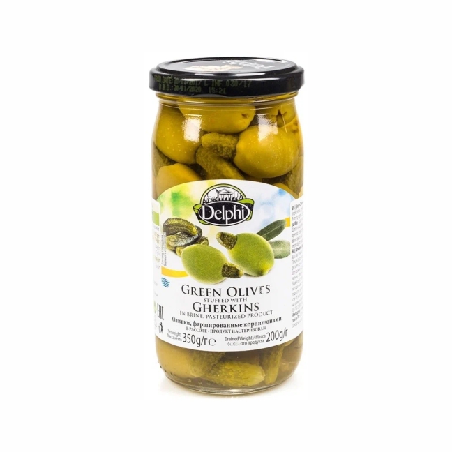 Оливки фаршированные корнишонами Delphi 350 гр ст/б 1/12 Греция