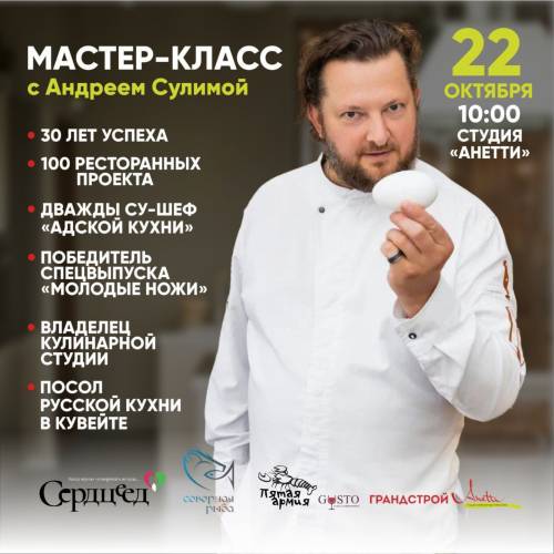 Дорогие друзья: шефы, рестораторы, су-шефы, повара, 22 октября приглашаем Вас посетить мастер-класс с Андреем Сулимой. На мастер-классе мы поговорим на темы: