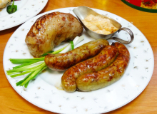 В качестве гарнира было тоже заявлено необычное блюдо - картофельная колбаса. Для колбасы использовали натуральную череву, которую набивали тертым картофелем с обжаренным на сковороде луком и шкварками. При этом, повар подчеркнул, что колбасу необходимо проткнуть иголкой в нескольких местах, чтобы черева не лопнула. Колбаски выпекали в пароконвектомате при 180˚С в течении 20мин.
