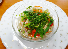 Для салата использовались огурцы, помидоры, копченый угорь, листья шпината и мангольта. Григорий специально уделил внимание правильной промывке зелени - 1% уксусный раствор и 1% соляной раствор, плюс обязательная сушка в барабане. Это не только обязательное условие для ресторанной кухни, но и способ продлить свежесть зелени. Ингредиенты для салата смешивались и заправлялись уксусно-кунжутной заправкой «Hellman’s». В ассортименте компании «Пятая Армия» и супермаркете «Деликатес» присутствуют 4 вида – масляно-уксускной заправки с разными вкусами - кунжутно-соевая, маракуйя и мандарин, с малиновым уксусом и цитрусовая. Но это еще не все, подача салата