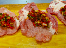 Для этого блюда взяли карбонад - мягкое и постное мясо. Нарезали на большие плоские куски, около полутора сантиметров шириной, и отбили. В центр отбивной уложили мелко измельченные овощи смешанные с томатами пронто. Обернули в жировую баранью сетку и хорошо прожарили. При этом мясо осталось сочным, а тонкая жировая сетка напоминала узоры оренбургского платка.